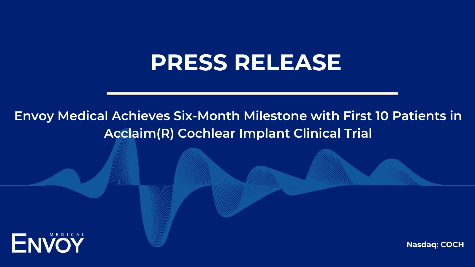 White Bear Lake, Minnesota--(Newsfile Corp. - November 18, 2025) - Envoy Medical® Inc. (NASDAQ: COCH) ("Envoy Medical" or the "Company"), a hearing health company pioneering fully implanted hearing solutions, today announced that all 10 patients in the first stage of its pivotal clinical trial for the investigational Acclaim® fully implanted cochlear implant have successfully completed their six-month follow-up visits. Notably, there have been no serious adverse events reported, reinforcing the trial's positive progress and the device's promising safety profile.