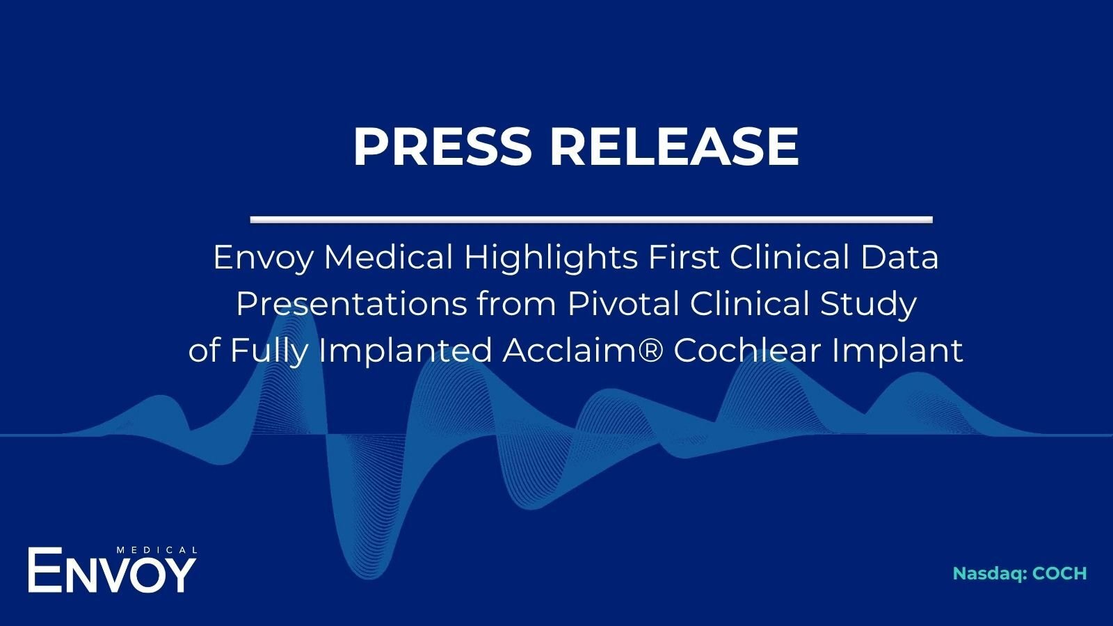 White Bear Lake, Minnesota--(Newsfile Corp. - April 28, 2026) - Envoy Medical® Inc. (NASDAQ: COCH) ("Envoy Medical" or the "Company"), a hearing health company pioneering fully implanted hearing solutions, today announced the first podium presentations of clinical data from the first stage of its pivotal clinical study of the investigational Acclaim® cochlear implant, a first-of-its-kind, fully implanted cochlear implant system. The Company will host a Fireside Chat with Dr. Theodore McRackan, MD, MSCR and Dr. Elizabeth Camposeo, AuD from the Medical University of South Carolina (MUSC) on Wednesday April 29, 2026 at 4:30 pm ET to review the data and its clinical implications.