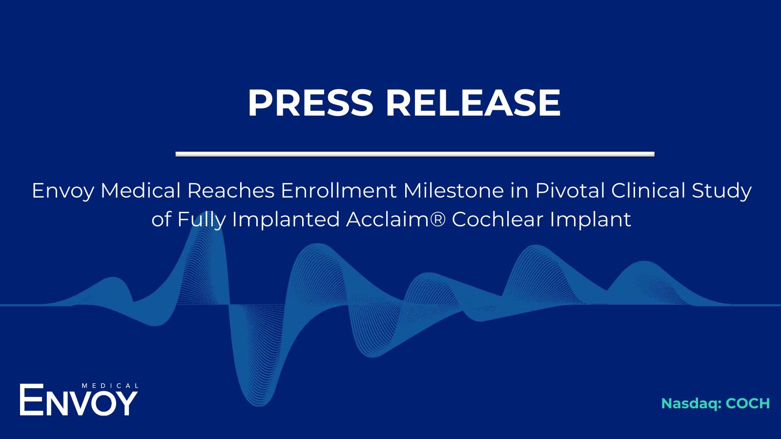 White Bear Lake, Minnesota--(Newsfile Corp. - December 18, 2025) - Envoy Medical® Inc. (NASDAQ: COCH) ("Envoy Medical" or the "Company"), a hearing health company pioneering fully implanted hearing solutions, today announced that its pivotal clinical study for the investigational fully implanted Acclaim® cochlear implant has achieved yet another milestone by reaching the midway point of the study's full enrollment target.